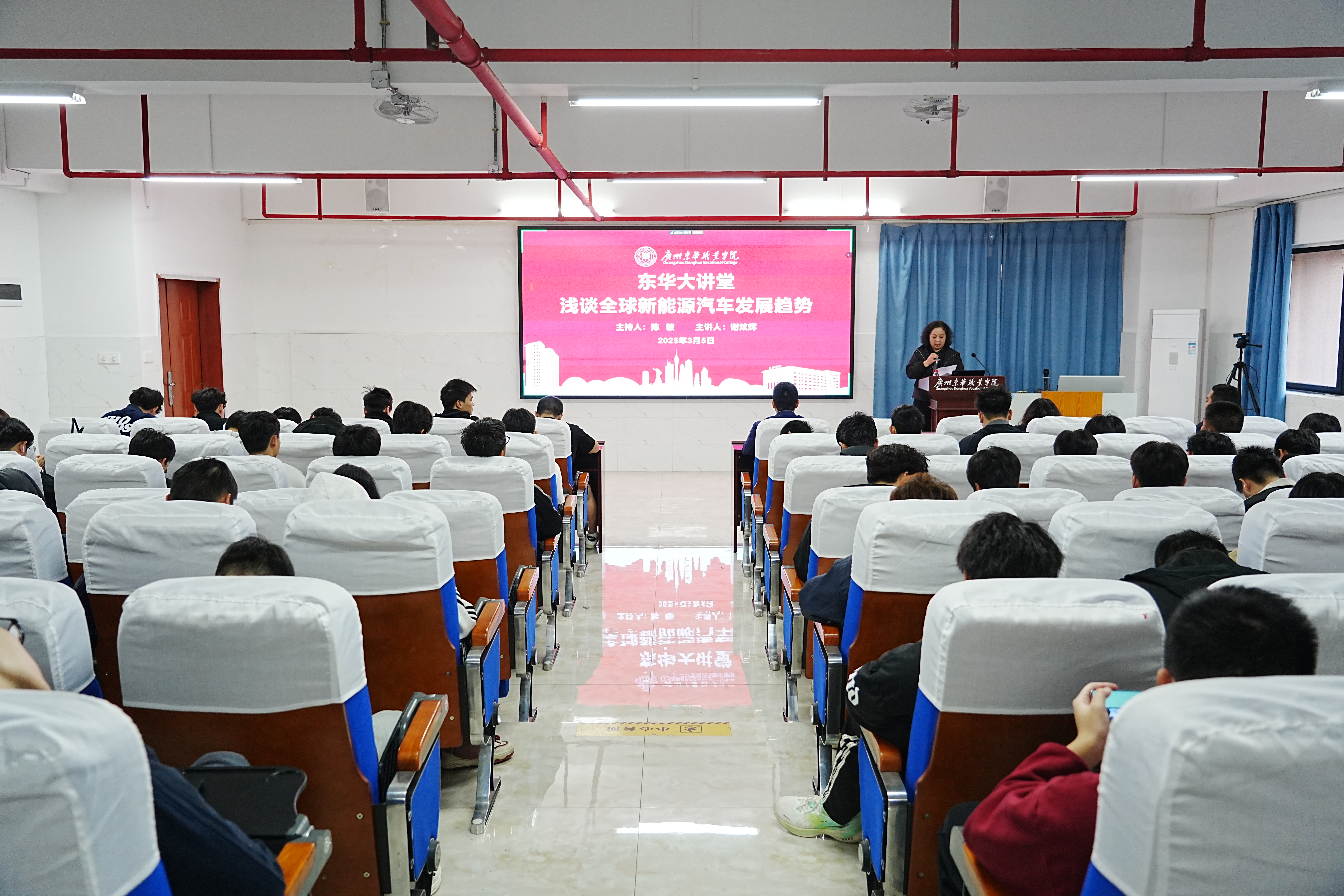 2025年3月5日,由学校教务处主办、智能机电学院承办的东华大讲堂第二讲——《浅谈全球新能源汽车发展趋势》在实训大楼开讲。