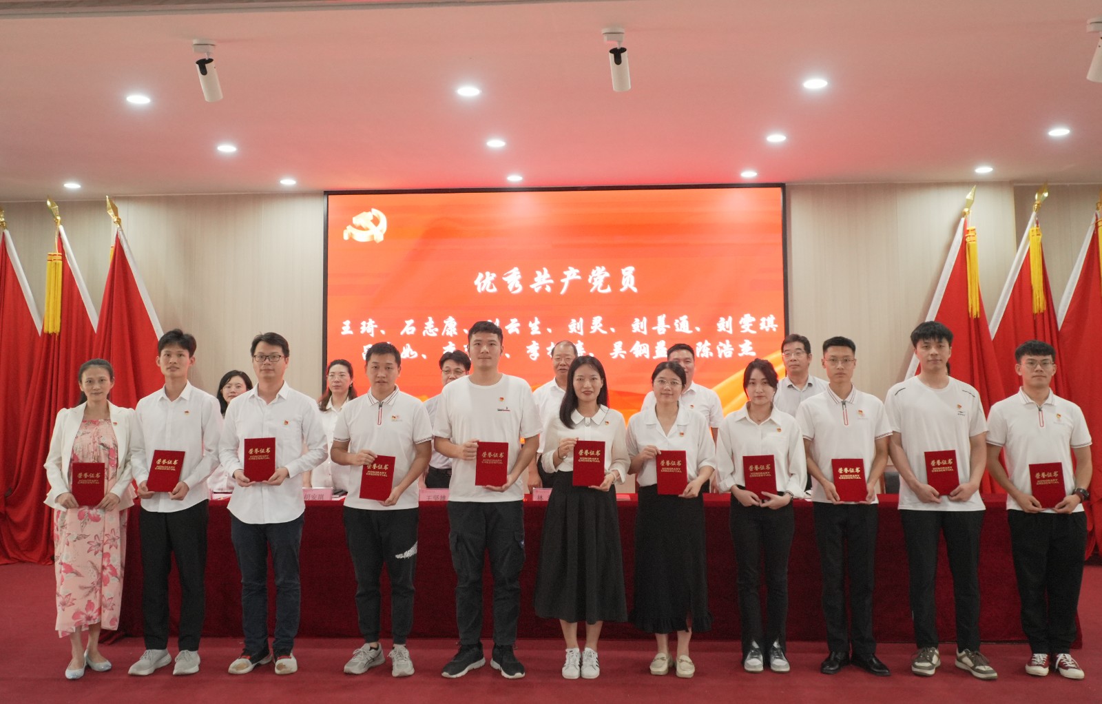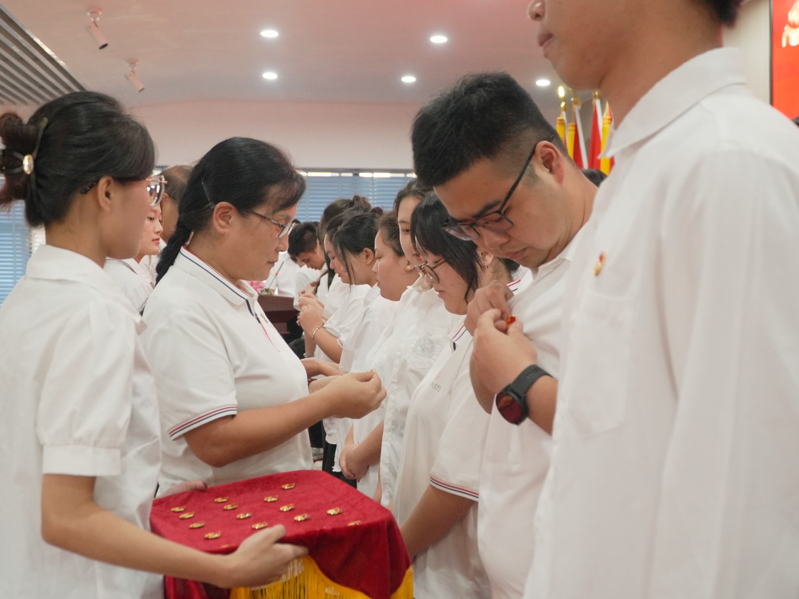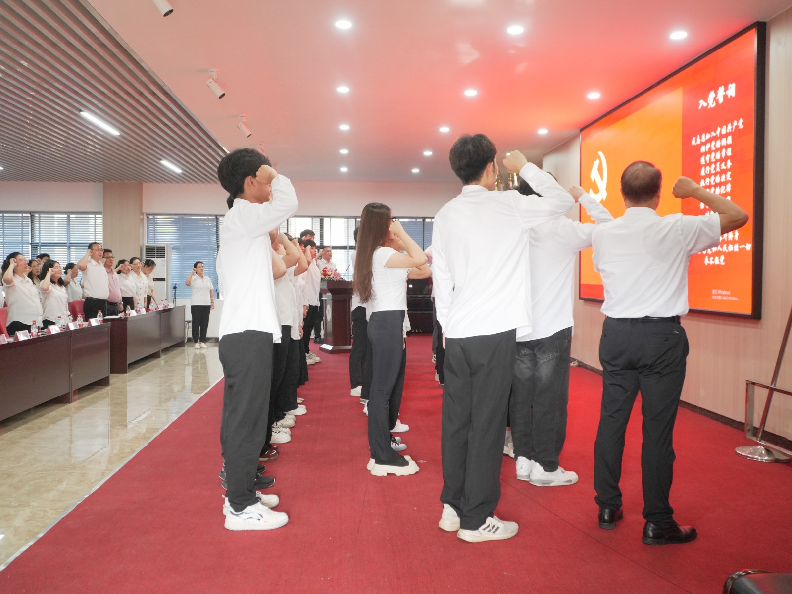 学校领导为新发展党员佩戴党员徽章,林清才书记带领新党员宣誓,全体党员一同宣读入党誓词。