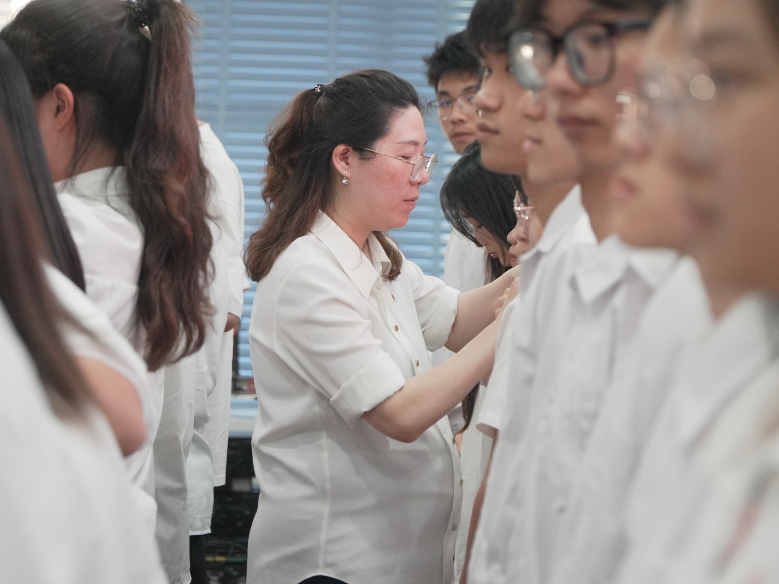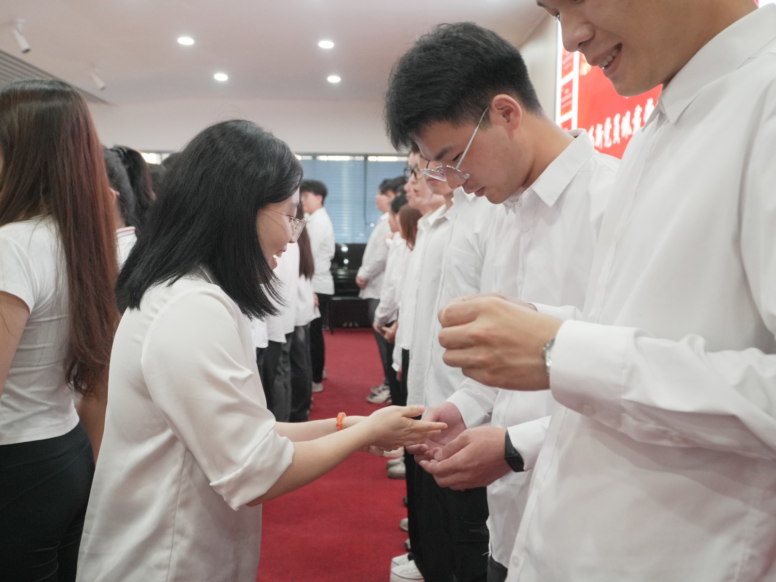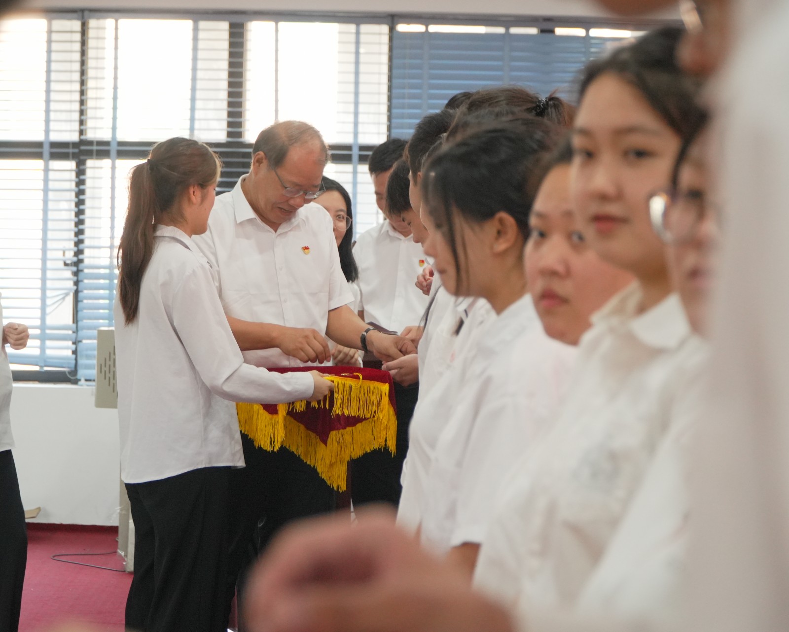 学校领导为新发展党员佩戴党员徽章,林清才书记带领新党员宣誓,全体党员一同宣读入党誓词。