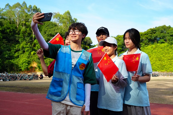 ▲在这阳光明媚的户外场地上,一群朝气蓬勃的青年正用手机记录下这充满爱国情怀的瞬间。画面近处,一位身着蓝色志愿者背心的男生高举手机,带领着几位手持小国旗的同学一同自拍。他们脸上洋溢着自豪与喜悦,鲜艳的五星红旗在手中飘扬,成为画面中最亮眼的色彩。