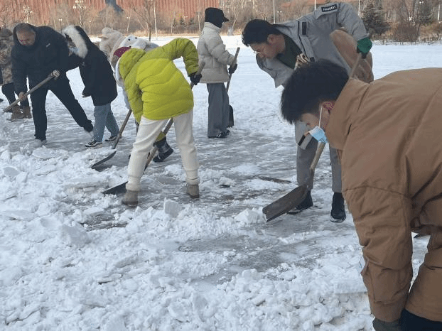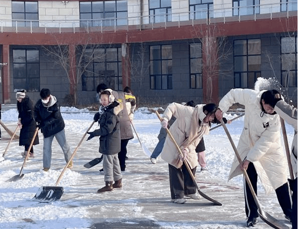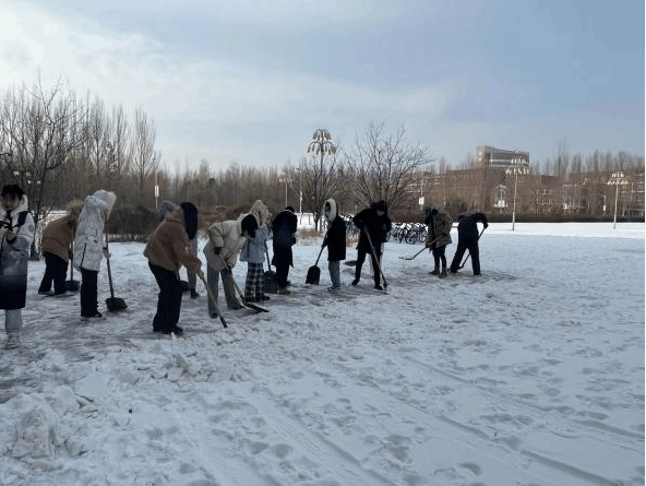 志愿者们拿上铁锹、扫帚、雪铲等工具来到美术楼、音乐楼及音乐厅广场前,将积雪推至主要道路两侧,为师生开辟一条安全通畅的方便之路,全力保障师生出行与道路安全,为学校消除潜在危险隐患。
