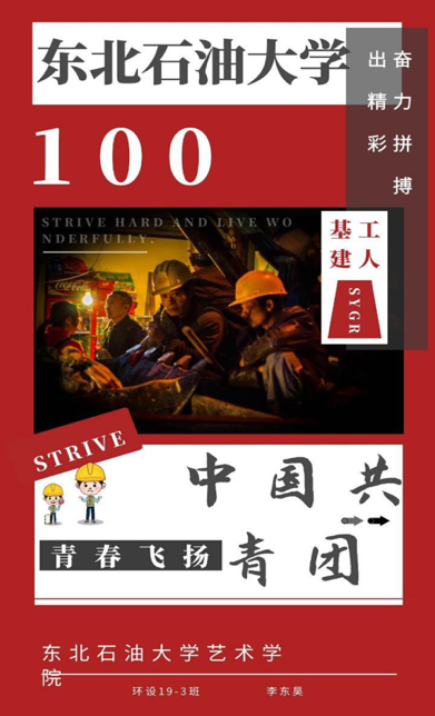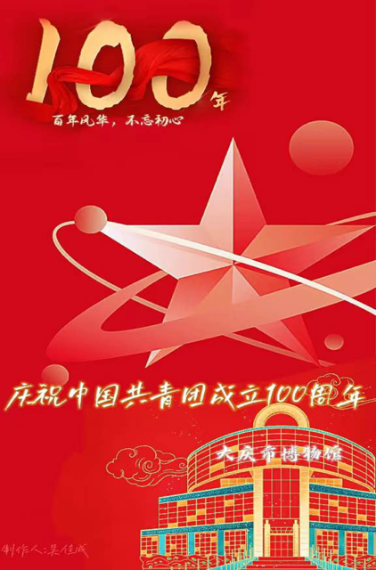 海报的设计不仅融入了我校及大庆市的特色标识,还增添了庆祝中国共青团成立一百周年的元素。一幅幅创意作品以视觉设计展现百年征程,用艺术语言描述光辉岁月。值此百年之际,我们将用行动传达情感,让红色基因、时代薪火代代相传。
