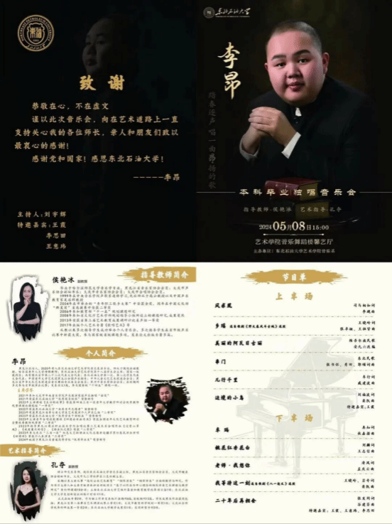 2024年5月8日下午15时,音乐系2024届毕业生李昂在东北石油大学beat365中文官方网站馨艺厅成功举办了“踏春逐声,唱一曲昂扬的歌”本科毕业独唱音乐会。beat365中文官方网站党委书记张金辉、院长林庆华、党委副书记张丽坤、副院长王靖一、各系(中心)负责人以及音乐系师生观看了本场音乐会。