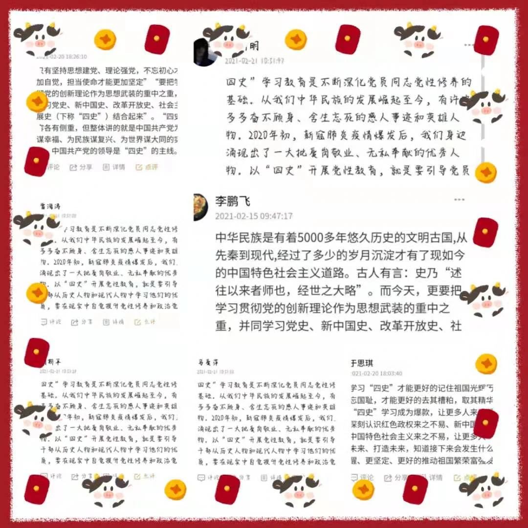 “学习四史践使命”线上读书分享活动进一步激发了同学们心中的责任与担当。希望同学们内化于心、外化于行,积极投入到学习工作当中,把学习的成果转化为实际成效,肩负起建设祖国的重任,不断地学习武装自己,使自己成为一个有用之才,为实现中国梦努力奋斗!