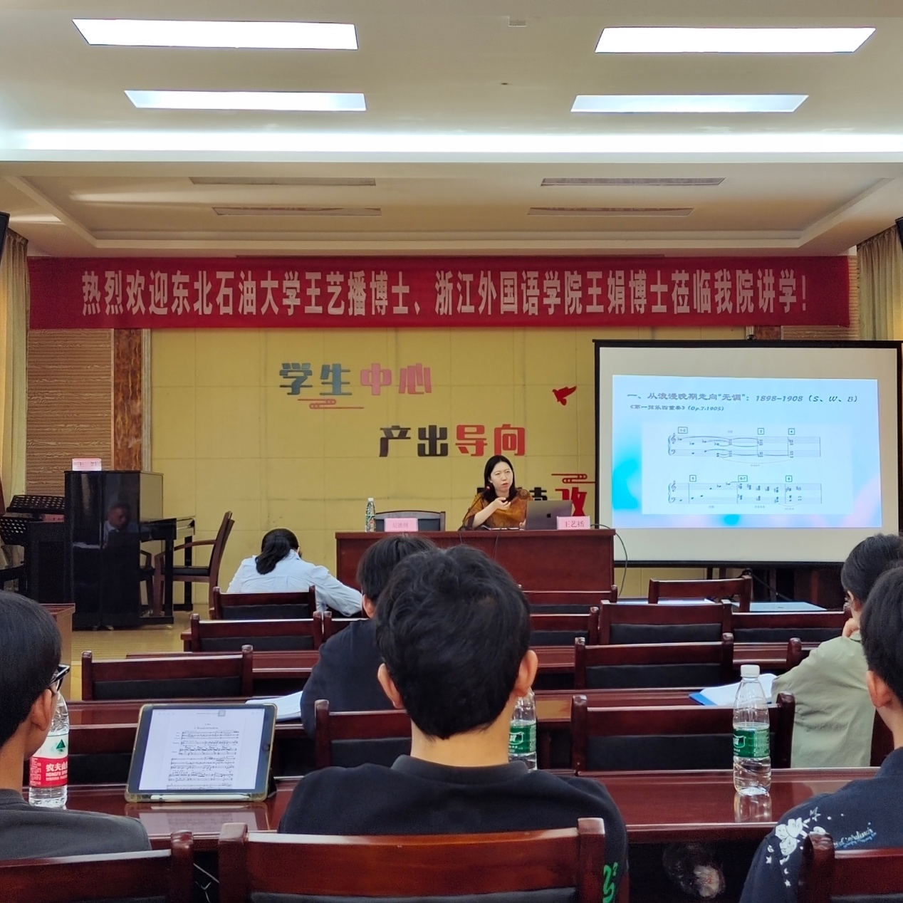 此次后调性系列巡讲,获得四所院校的高度认可。王艺播所承担的第四讲《自由无调性——第二维也纳乐派早期创作中的音高组织》,从史学的角度梳理了第二维也纳乐派三位作曲家在自由无调性阶段创作中其音高组织逻辑所体现出来的调性特征,与尝试背离这些特征去寻求新的音高组织关系间交混状态。该讲座从音高中心、和声功能、旋律构成、音响织体、体裁曲式等各个层面,全方位地探讨了转型时期音乐创作的变化及其所带来的理论问题。其中对所选经典作品的分析,主讲人采用了多元化、多维度的分析技术,并因此获得了对这些作品较之以往不同的新的结论,凸显其理论创新建树之端倪。