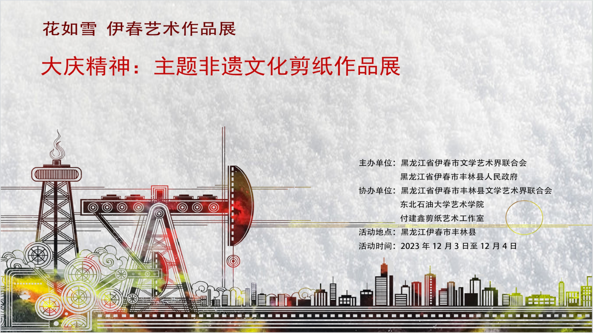 付建鑫老师代表学院展出了以“大庆精神”为主题的非遗文化剪纸展,并在活动论坛上深入介绍了学院的非遗研究及教育情况,对“大庆精神”主题非遗文化剪纸的研究、创作、发展、实践进行了详细阐述。付建鑫老师的“大庆精神”主题非遗文化剪纸展,展示了对大庆石油文化的深刻理解和对非遗剪纸技艺的传承创新。剪纸作品通过对大庆精神的表达,以独特的手法将石油文化元素巧妙融入传统剪纸艺术中,展示了非物质文化遗产与现代文化相融合的艺术魅力。