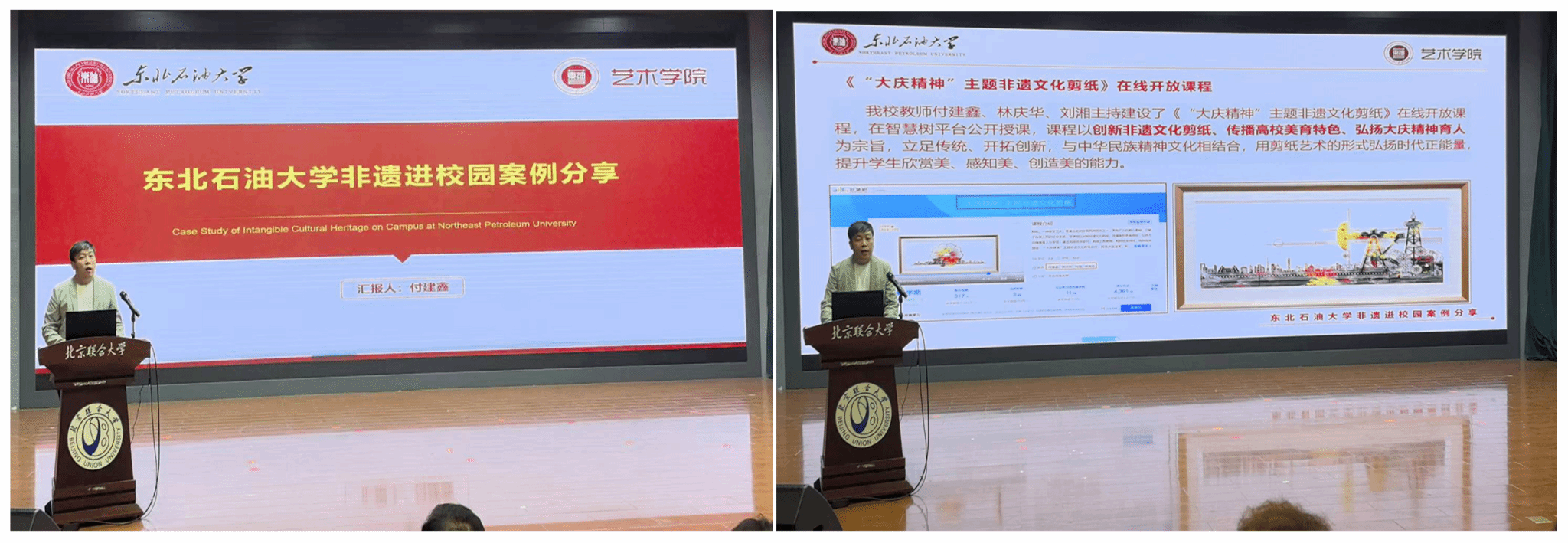 教师付建鑫受邀进行了“东北石油大学非遗进校园案例分享”主题讲座,从两个省级非遗基地成功申请、非遗课程模式、非遗工作室建设、研究成果、实践成果等方面,分享了我校在非遗教学和研究方面的特色做法,并重点介绍了《“大庆精神”主题非遗文化剪纸》项目所取得的一些列成果。会后,多所高校主动对接,希望开展校际非遗教育合作。