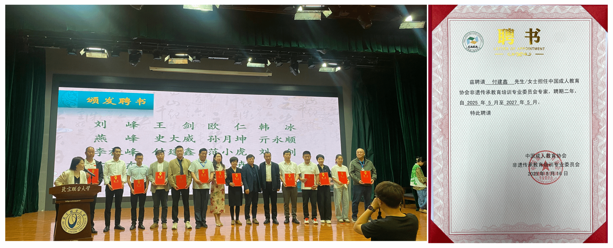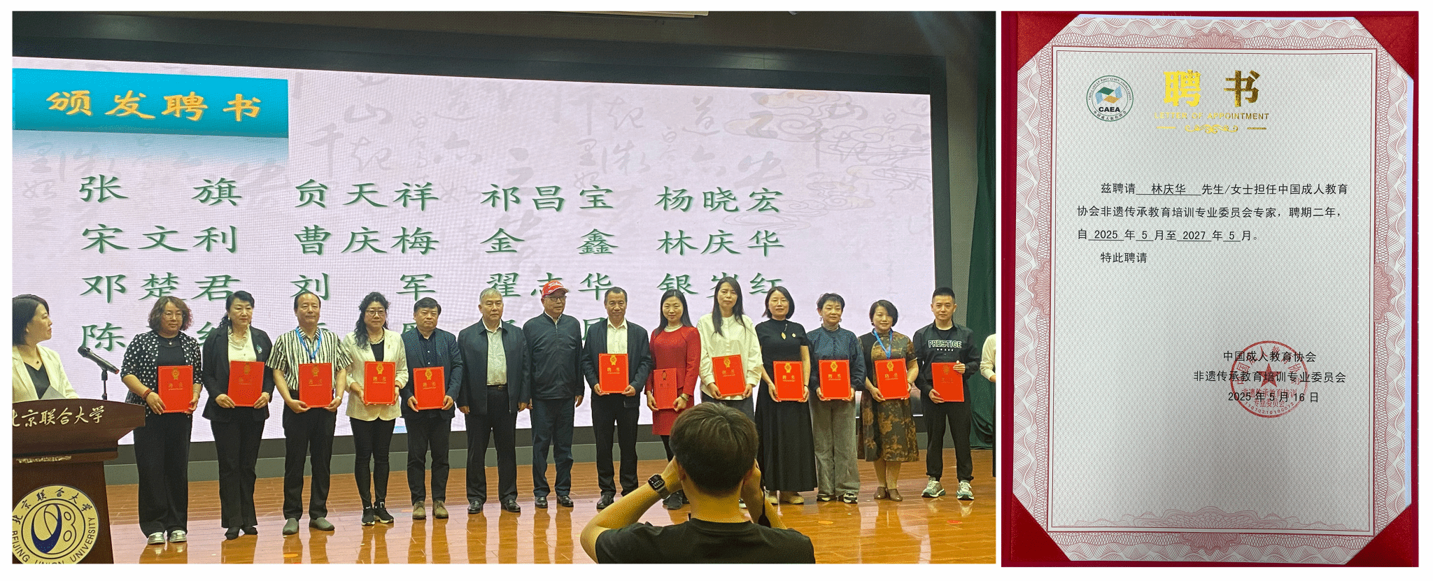 在大会重要环节中,beat365中文官方网站两位教师双双获得行业权威认可。院长林庆华、教师付建鑫经严格遴选,被聘任为非遗传承教育培训专业委员会首批专家,聘期两年。该委员会作为国家级非遗教育指导机构,此次专家聘任标志着我校在非遗教育领域的研究实力获得业界高度肯定。