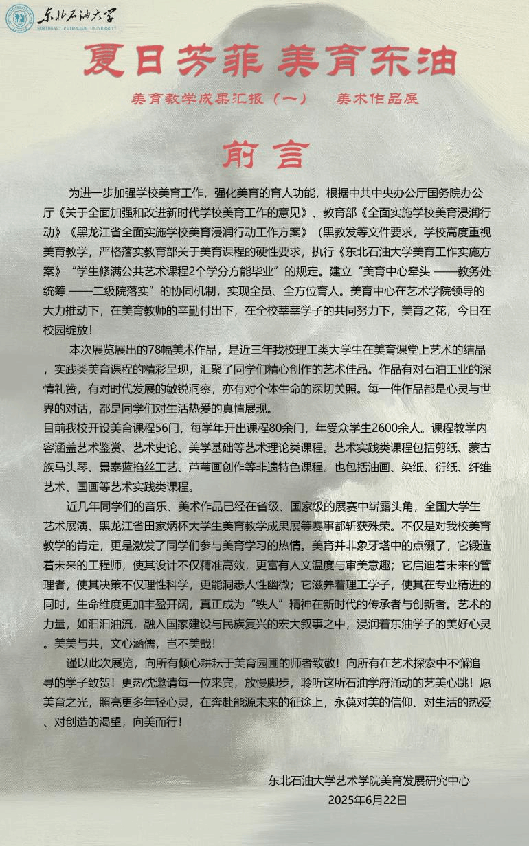 beat365中文官方网站院长林庆华表示:“本次展览不仅是对过往美育教学成果的梳理与肯定,更是面向未来的新起点。我们将持续深化美育教学改革,厚植育人沃土,以艺术之光涵养师生心灵,以创新之力服务社会发展,为培养担当民族复兴大任的时代新人贡献艺术的力量。”本次美育教学成果展将持续展出至9月份。展览开放期间,众多师生与社会艺术爱好者纷纷前来参观,观众或驻足细品画作深意,或拍照留存设计巧思,或交流探讨创作理念,沉浸于这场精心筹备的美育之约中。这场夏日的艺术绽放,不仅为东油校园增添了浓郁的文化气息,更如清泉般润泽师生心田,生动诠释了美育在立德树人、培根铸魂中的深远价值。