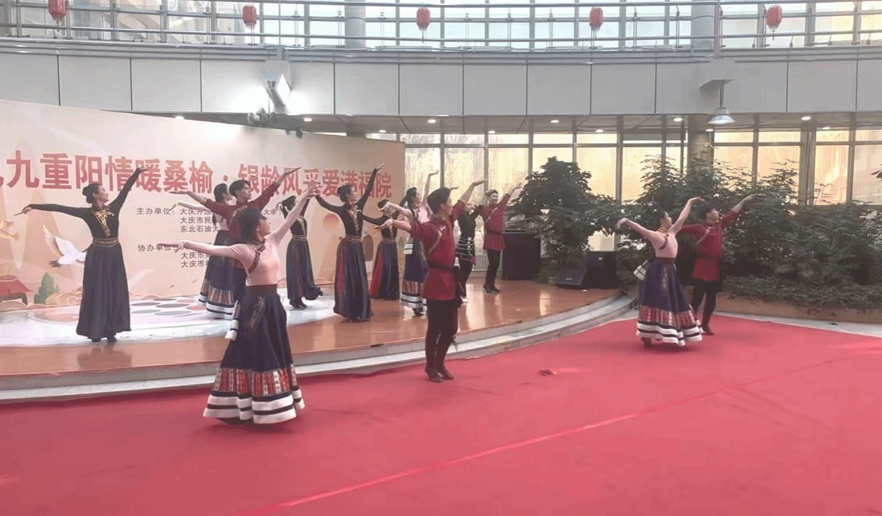 演出中,音乐系23级管弦1班张宏炎同学带来竹笛独奏《鸿雁》,悠扬笛声传递出对老人的深切祝福;舞蹈系邓亚兵、杨妍、胡艳霞等14位同学带来民族舞《情暖夕阳•民族韵》,极具特色的舞姿展现出青春活力与民族风情,也寄托了同学们对老人们晚年生活的美好祝愿。学生们精彩的表演感染了现场的观众,掌声与赞叹声不绝于耳。学生们以艺术传递温度与敬意,让老人们在重阳节感受到社会关怀。