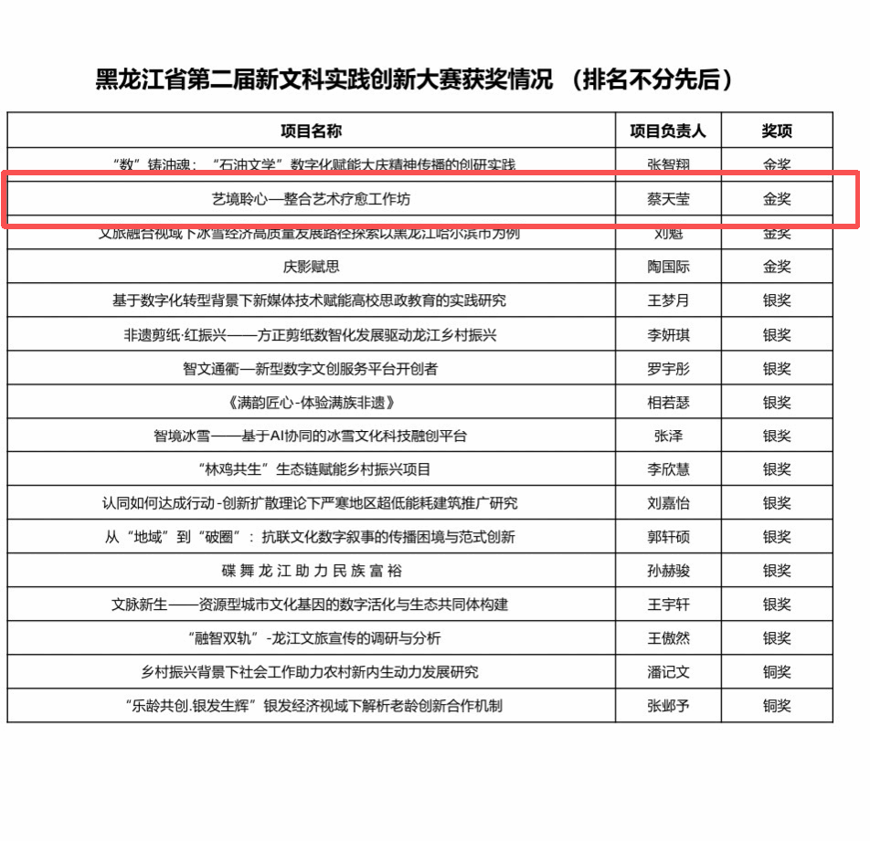 荣誉加冕,步履不停。未来,艺境聆心-整合艺术疗愈工作坊将以此为契机,总结参赛经验,深耕数智化时代艺术疗愈领域的跨学科实践探索,持续优化整合艺术疗愈体系,力争在更高水平的赛事与实践中再创佳绩。