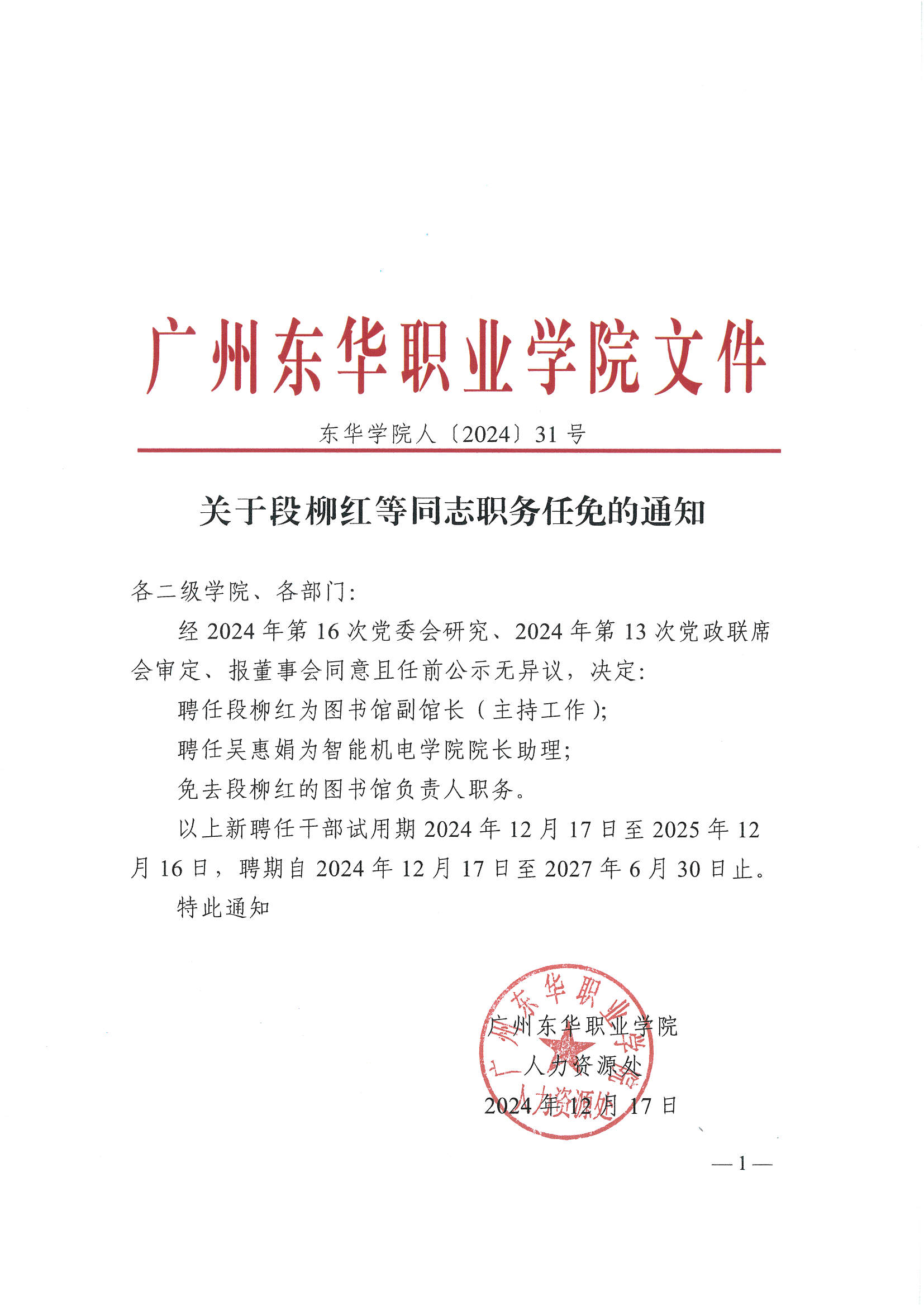 关于段柳红等同志职务任免的通知