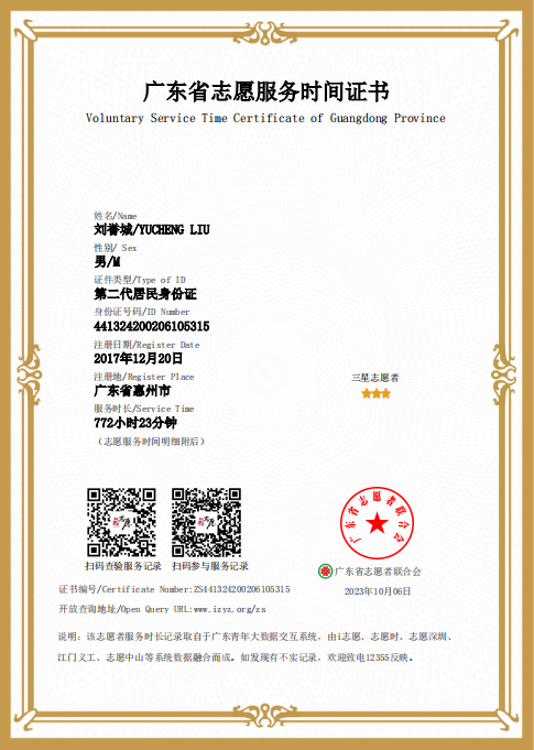刘誉城同学多次参加志愿服务活动,如疫情防控、七彩阳光暖童行动、协助交通秩序等,目前在i志愿平台上累计志愿服务时长772小时。