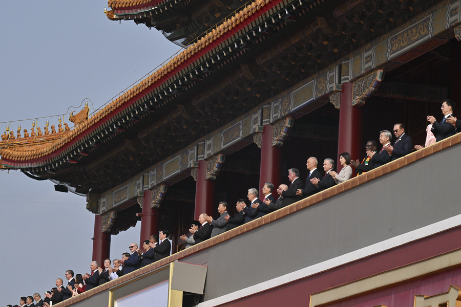9月3日,纪念中国人民抗日战争暨世界反法西斯战争胜利80周年大会在北京天安门广场隆重举行。这是大会开始前,中共中央总书记、国家主席、中央军委主席习近平同出席大会的外方代表团团长前往天安门城楼。新华社记者 丁林 摄