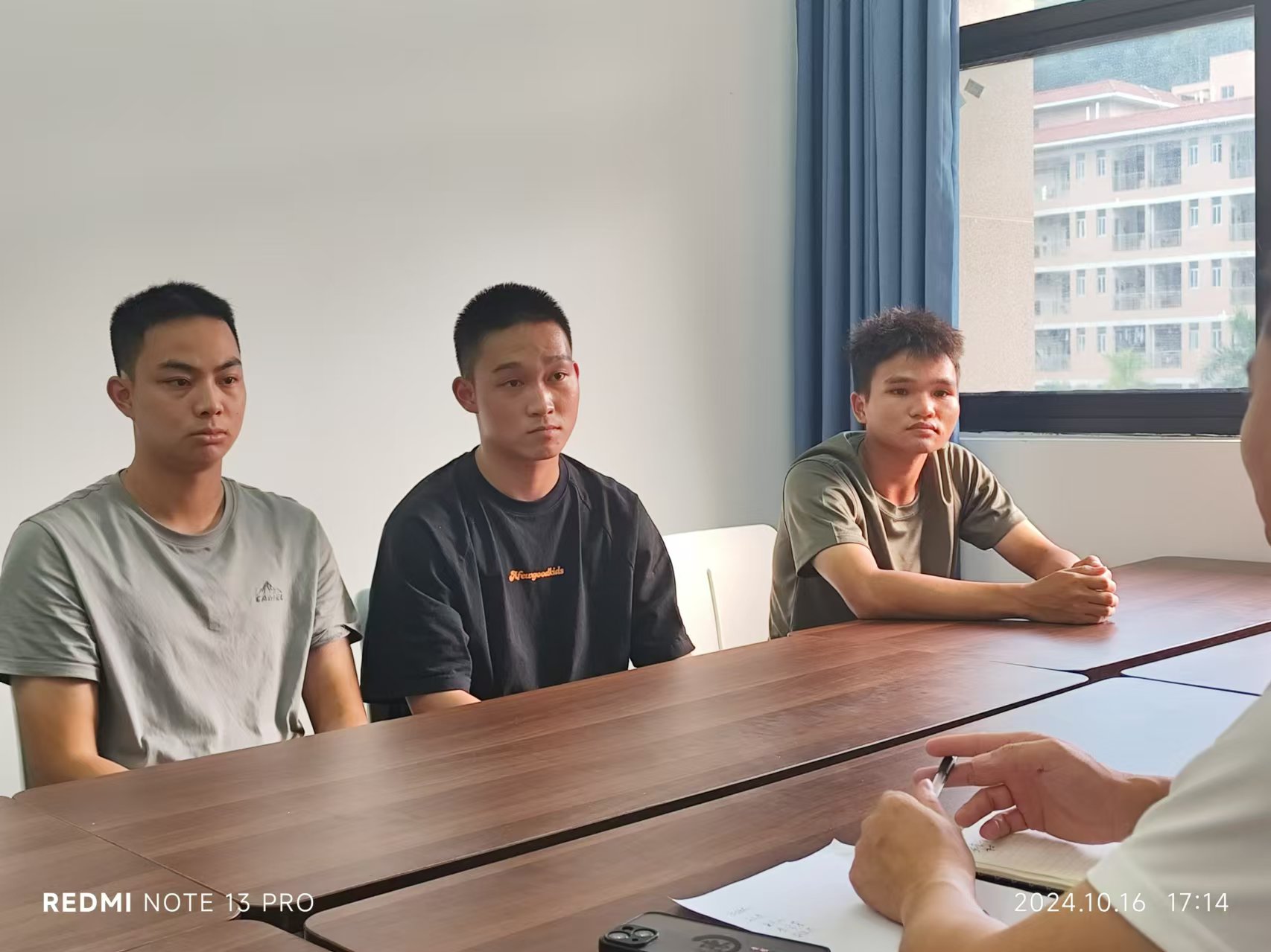 智能机电学校书记吴炜坤对重返校园的同学们给予了热烈欢迎。吴炜坤书记深入了解了同学们在部队的训练生活状况,对于同学们复学后所遇到的困惑,他逐一进行耐心解答,他表示退役学生们是学校的骄傲,学院将一如既往地关心和支持退役学生的学习和生活,为他们提供更好的发展平台。随后辅导员吕晓聪为退役学生们,详细的讲解了部分现有福利政策。